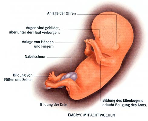 Aus der Zygote, der befruchteten Eizelle, entsteht in dieser Zeit der Embryo. So wird das heranwachsende Kind in den ersten acht Wochen genannt, bevor es sich zum Fetus weiterentwickelt. Während dieser Zeit werden alle Organe und Körpersysteme angelegt. Sie ist deshalb die empfindlichste Periode der Schwangerschaft. Wir möchten hier nicht alle Einzelheiten der faszinierenden Embryonalentwicklung schildern, sondern greifen einige Schritte exemplarisch heraus.