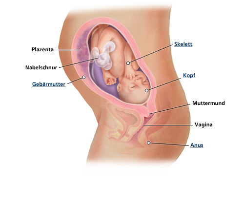 Die Kindsbewegungen werden in diesem Drittel häufiger. Das Kind nimmt nun die gesamte Gebärmutterhöhle ein. Durch den immer enger werdenden Raum rollt sich der Fetus häufig in die typische Embryonalstellung ein. In den letzten vier Wochen der Schwangerschaft senkt sich der Kopf des Kindes in das kleine Becken der Mutter. Die letzten Geburtsvorbereitungen sind in vollem Gange.